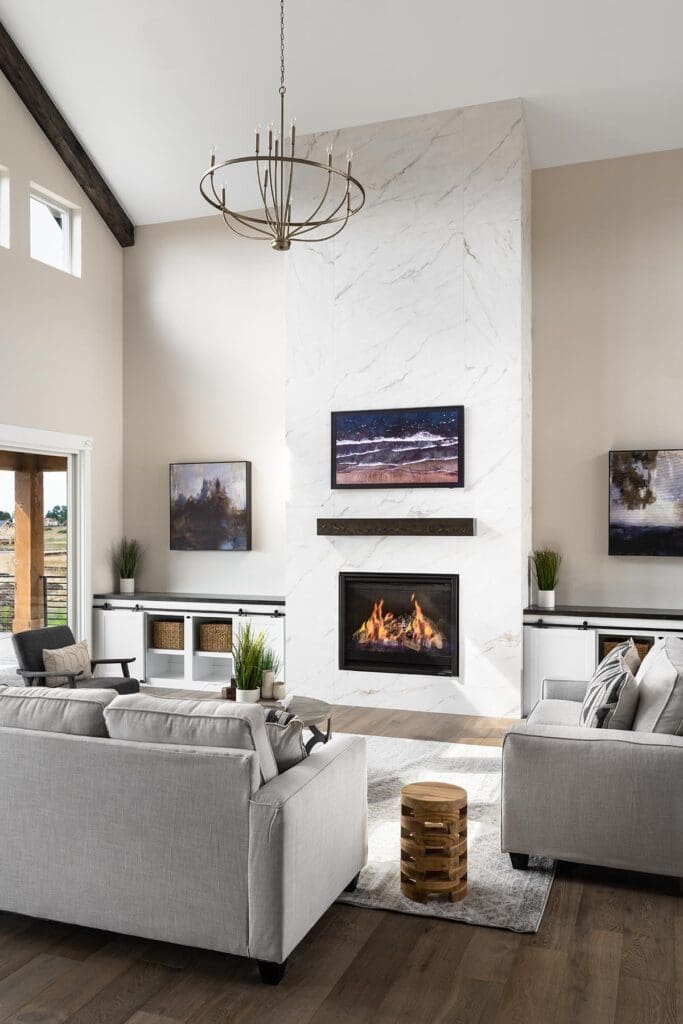 The great room is anchored by a gorgeous fireplace surrounded by built-ins.