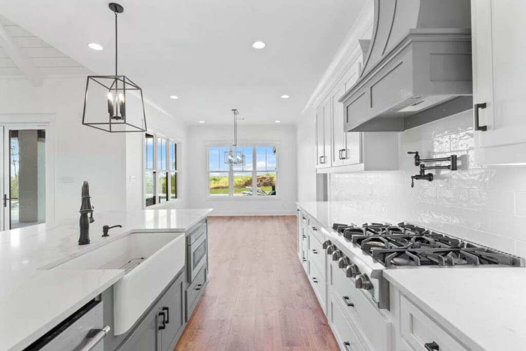 An oversized island anchors the space, perfect for meal prep, school projects, or wine-fueled charcuterie nights with your friends.
