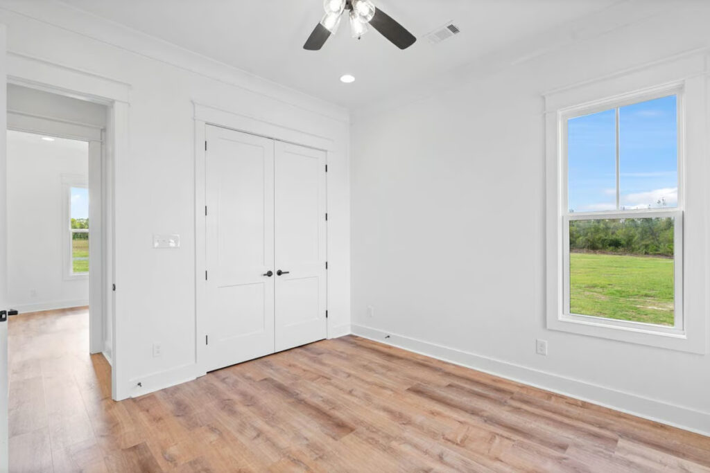 The Master Suite is tucked away for maximum privacy, with a tray ceiling and dreamy windows that overlook the backyard.