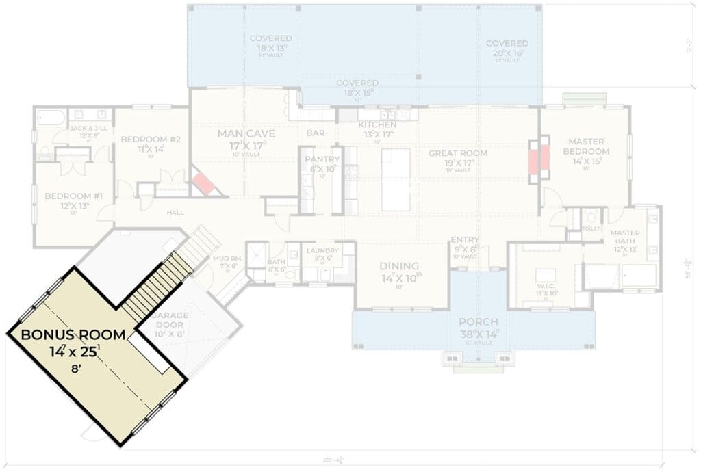 Above the garage, you’ll find a 431-square-foot bonus room.