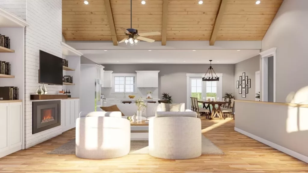 Walk through the front door, and bam — you’re greeted by a vaulted great room complete with exposed beams and a cozy fireplace that looks like it belongs on the cover of a home magazine.