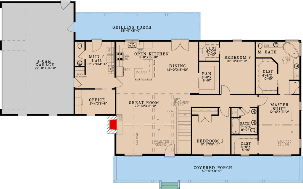 3-Bedroom 1-Story Country Ranch House with Home Office (Floor Plan)
