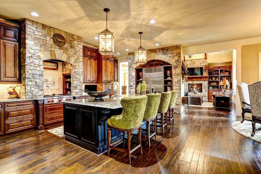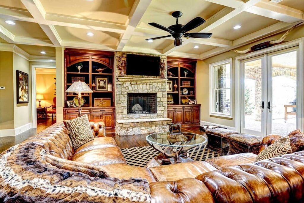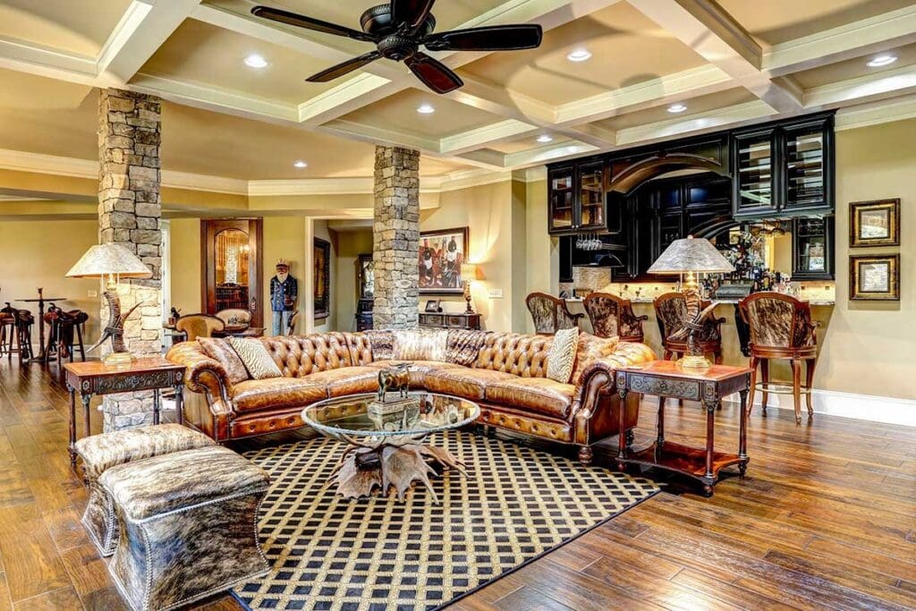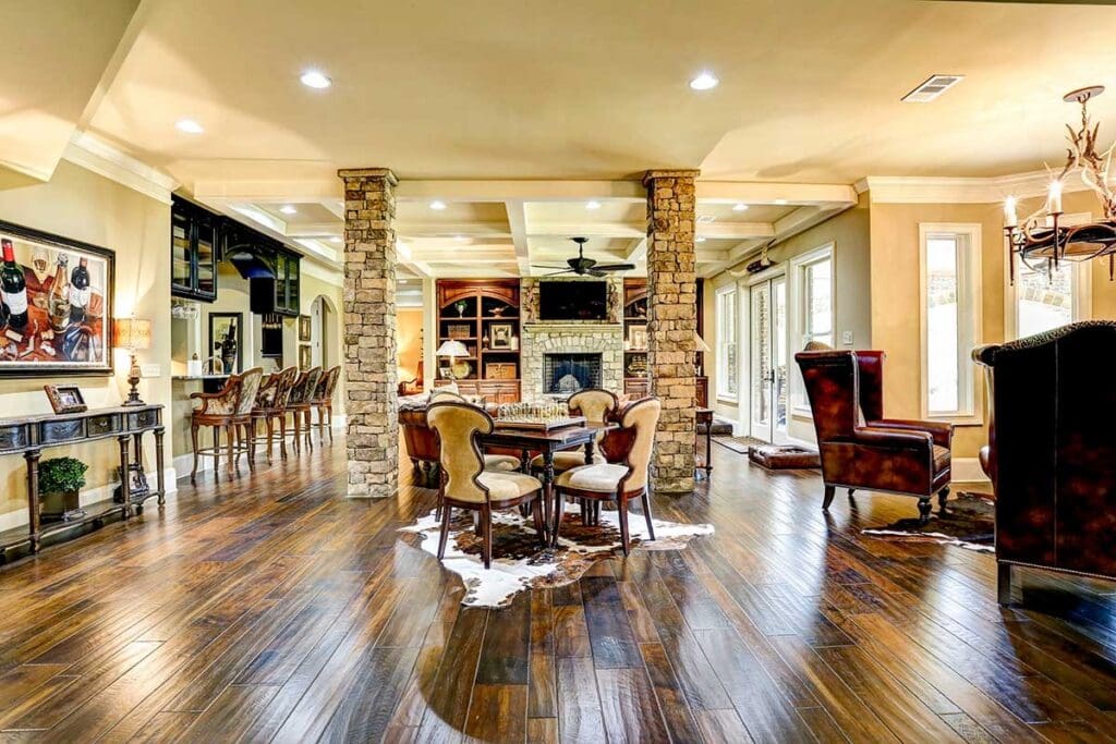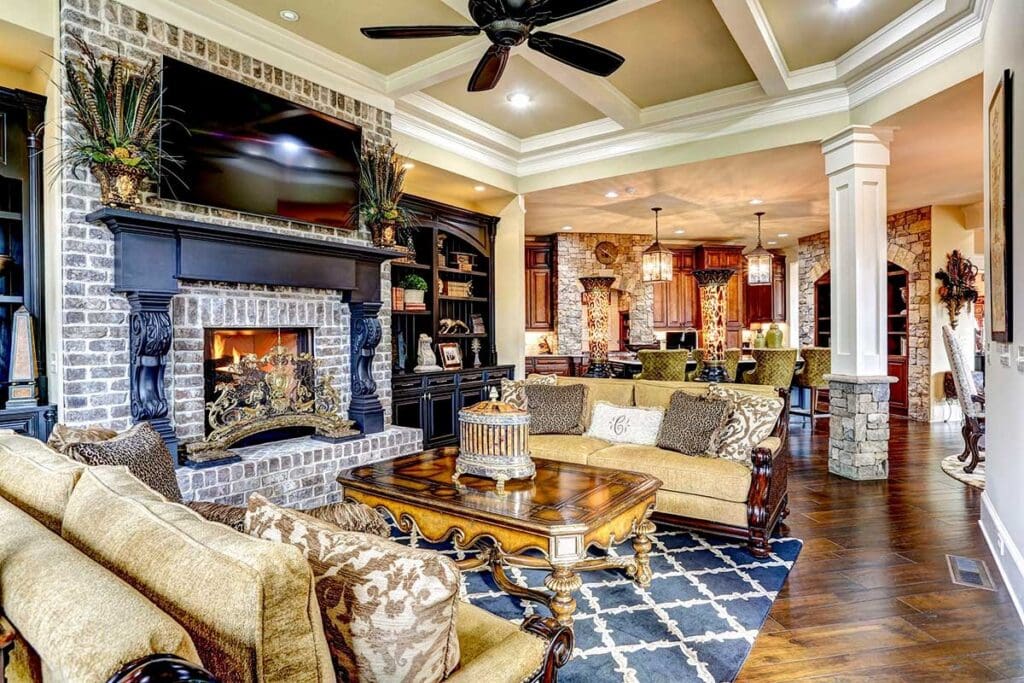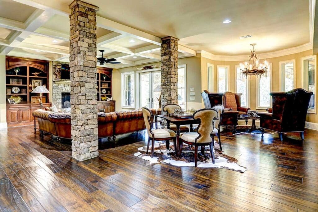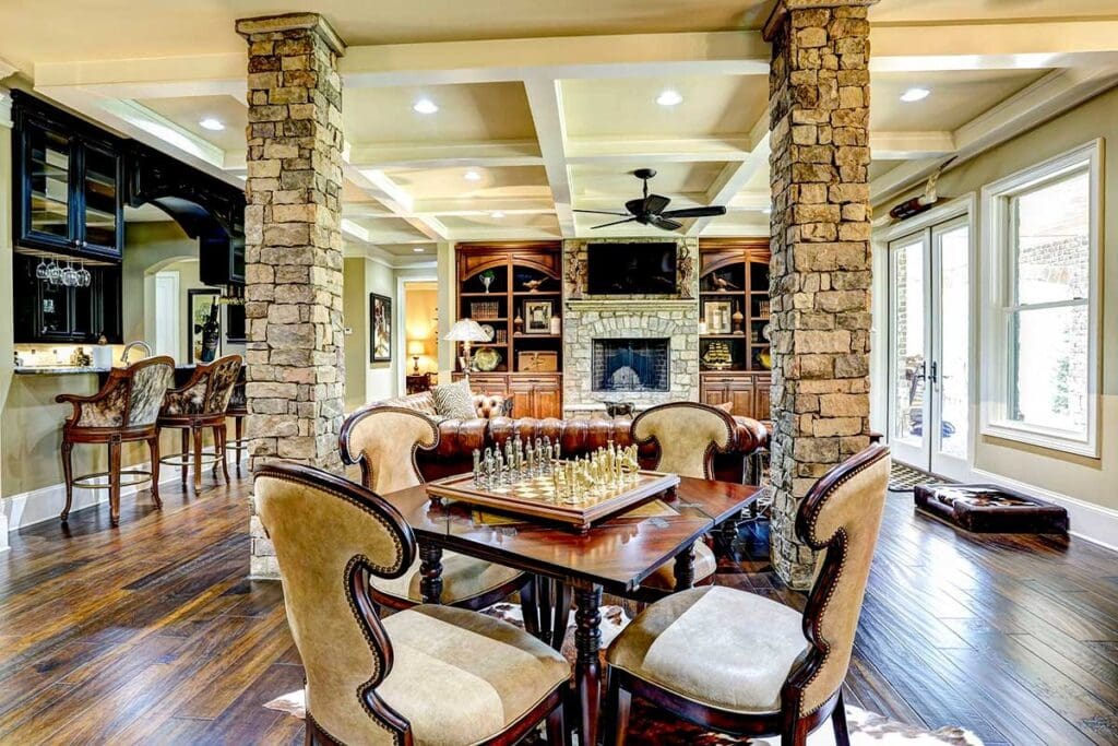 And with neutral tones in the kitchen, stone and wood accents, and those coffered and tray ceilings adding architectural drama, there’s enough character to stand on its own—or be dressed up to match your vision.