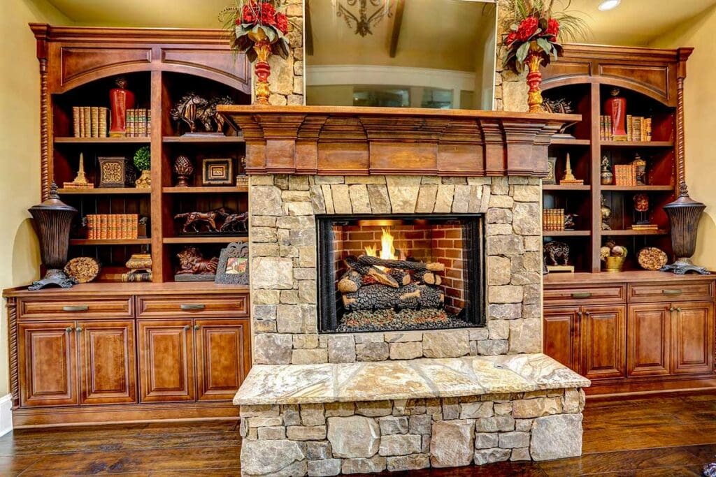 The fireplace is flanked by built-ins, perfect for books, decor, or an embarrassingly large collection of ceramic gnomes. No judgment.