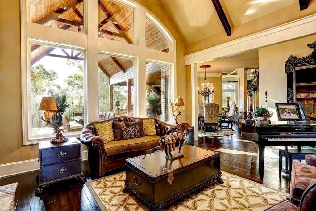 Now, as you take a few steps further in, the lodge room opens up—dramatic and bright, with light pouring in from the walls of glass that give you a panoramic view of the back porch and whatever oasis you decide to plant back there.