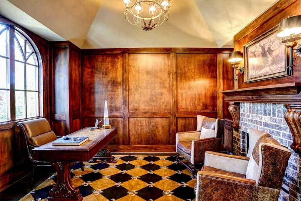 The private study, complete with its own fireplace and large windows, provides the ideal work-from-home setup.