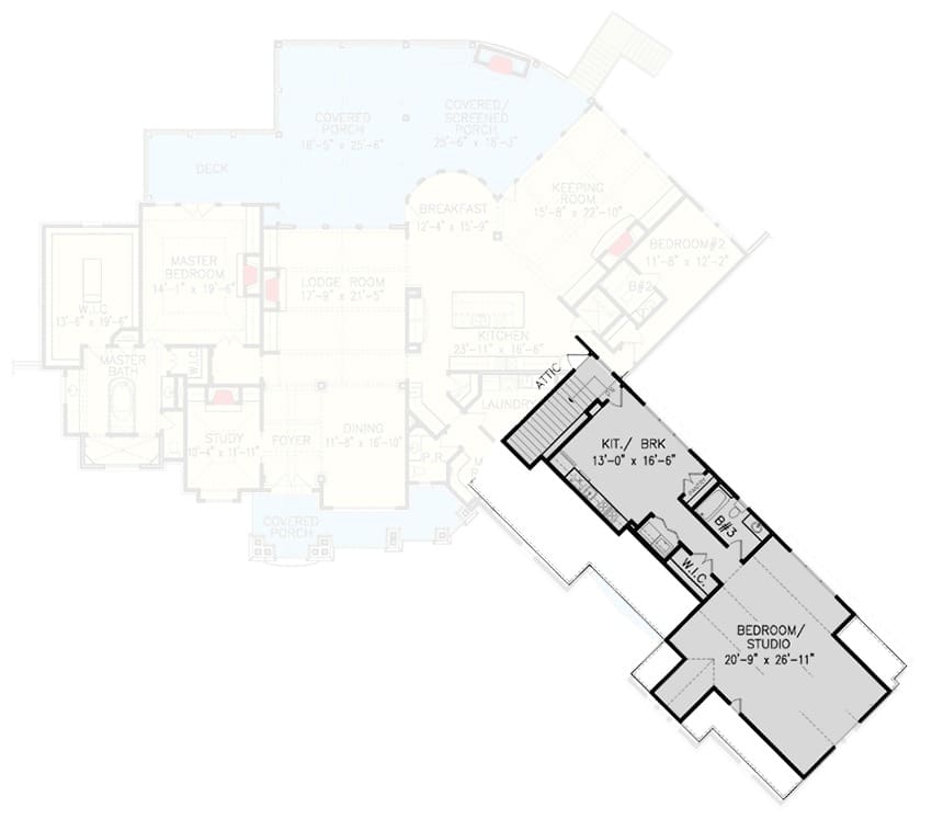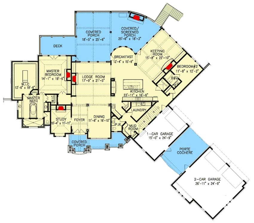 This home plan features fireplaces in the lodge room, the keeping room, and the study.