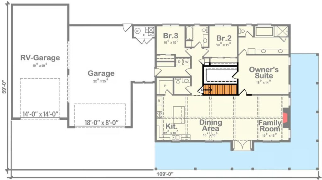 With 1,832 square feet, this beast of a garage includes an RV bay with a 14′ by 14′ overhead door.