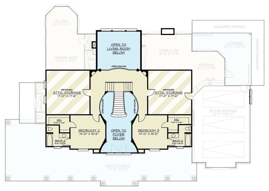 Upstairs, this house plan includes two generously-sized bedroom suites, each with its own bathroom.