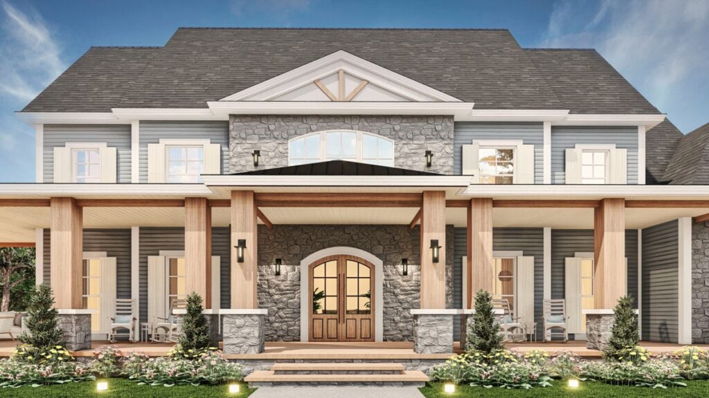 The first thing that grabs your attention is that sweeping front porch—big enough for morning coffee, afternoon chats, and full-blown rocking chair therapy.