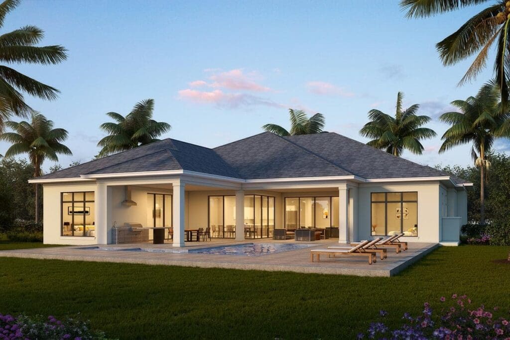 The rear lanai is fully integrated with the great room, kitchen, and bonus room via retractable glass walls.