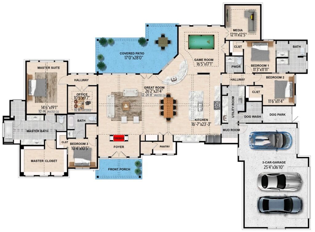 This plan also includes a dedicated media room that’s basically a built-in excuse for movie nights and binge-watching marathons.