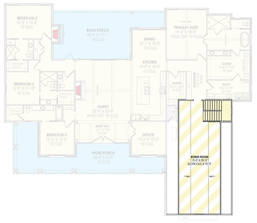 4-Bedroom 1-Story Modern Farmhouse With Bonus Room and Expansive Porches (Floor Plan)