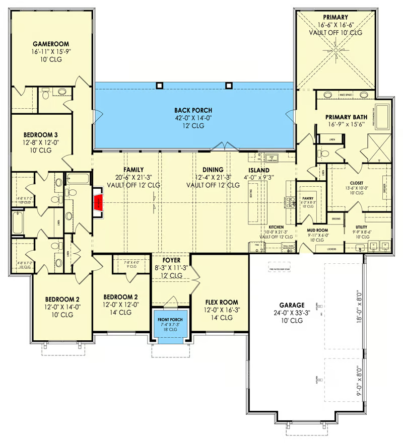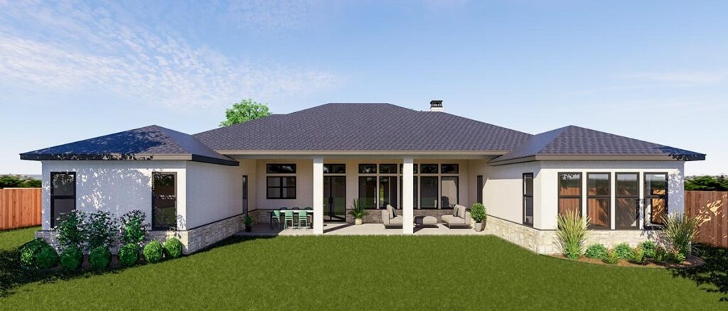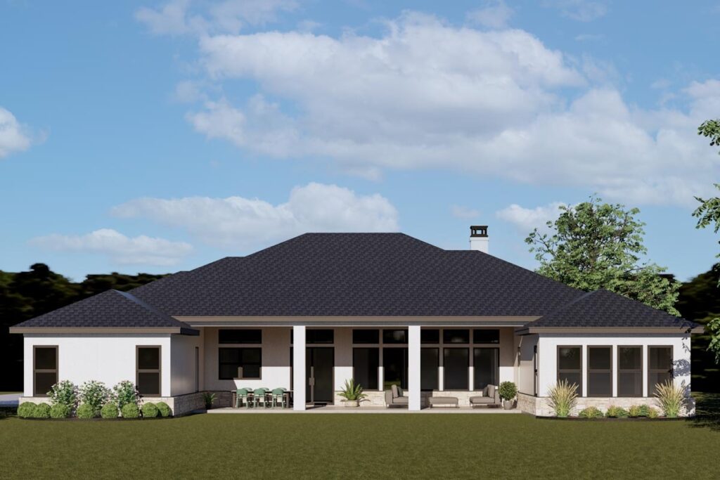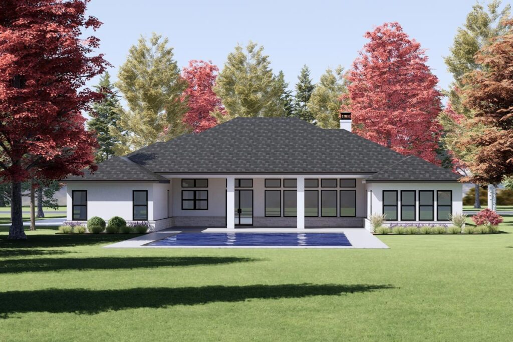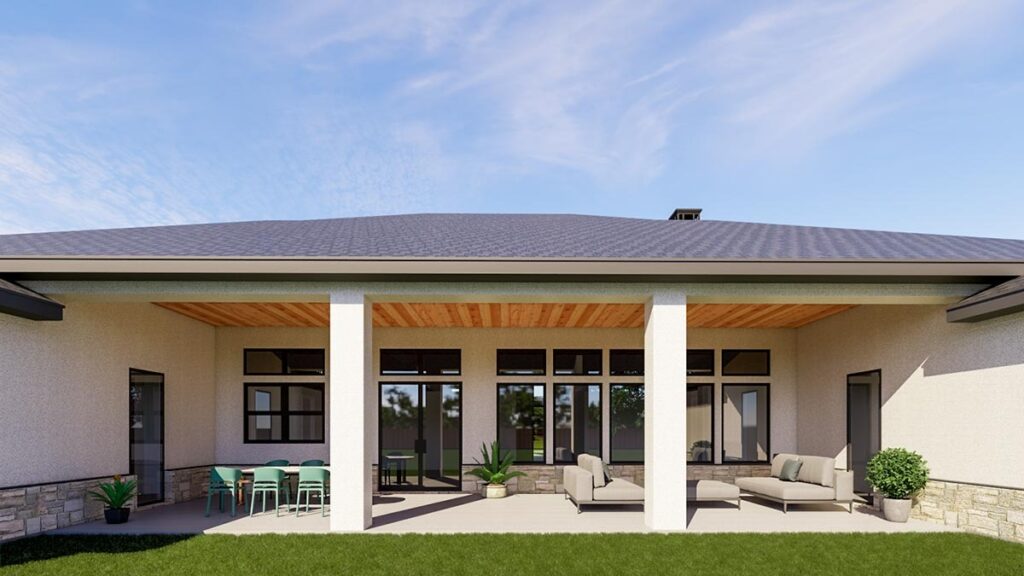 This ranch plan comes with a dreamy covered back porch that’s perfect for everything from family BBQs to stargazing with your favorite people.
