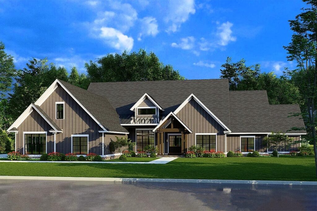Picture this: you pull up to a house that has serious storybook vibes — board and batten siding, a timber-trussed covered entry that just begs for seasonal wreaths, and a layout that’s as inviting as a homemade pie cooling on the windowsill. (I don’t even bake, but somehow this house makes me want to.)