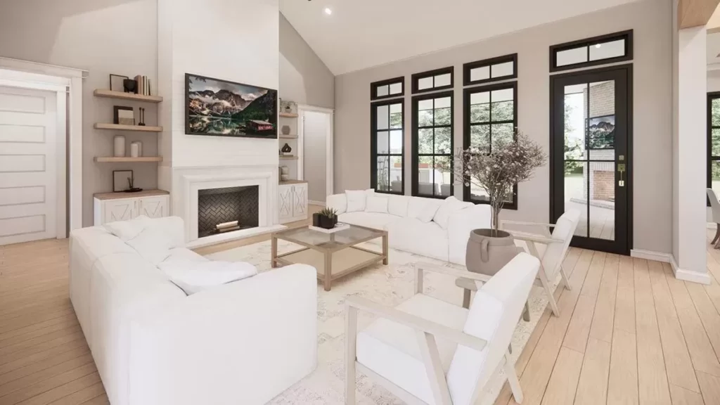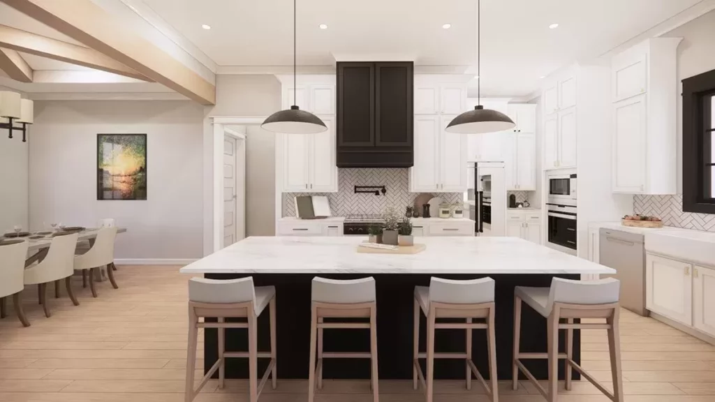 What makes this transitional farmhouse so appealing is how the layout manages to feel both expansive and efficient.