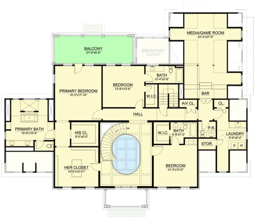 The upstairs layout proves this plan isn’t just about beauty—it’s about functionality.