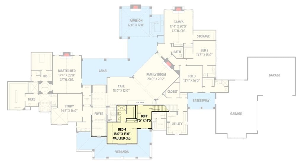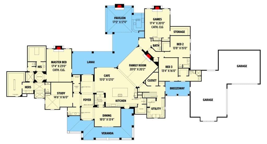 While the glamour of fireplaces and cathedral ceilings steals the show, let’s not overlook the practical heroes of this plan: the mud hall, utility room, and breezeway.