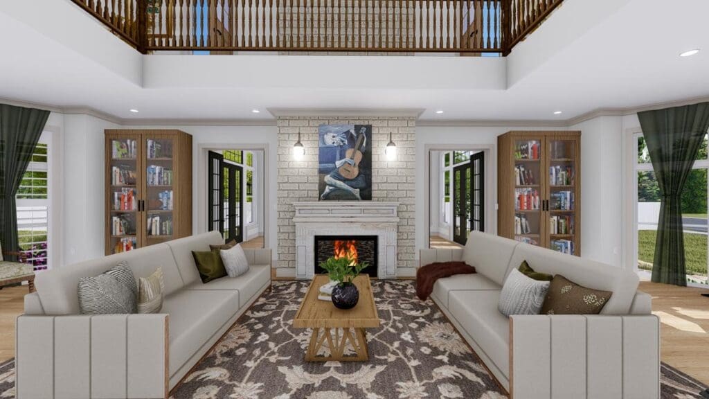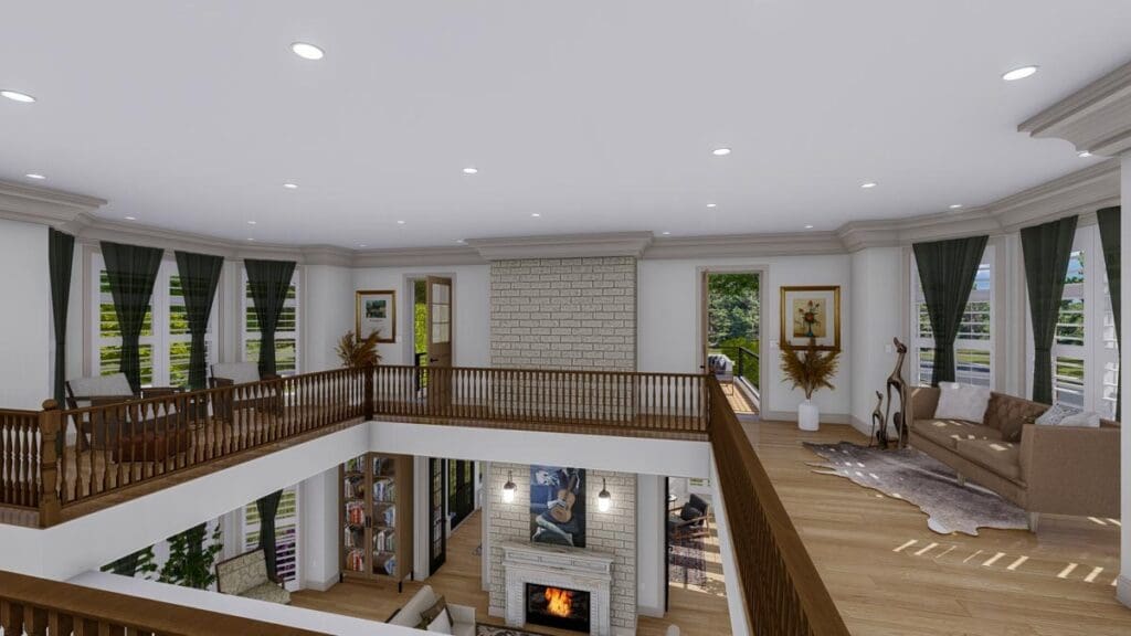 With a warm fireplace, towering bookshelves, and a second-floor balcony that overlooks the lower level, this space is one for the history books.