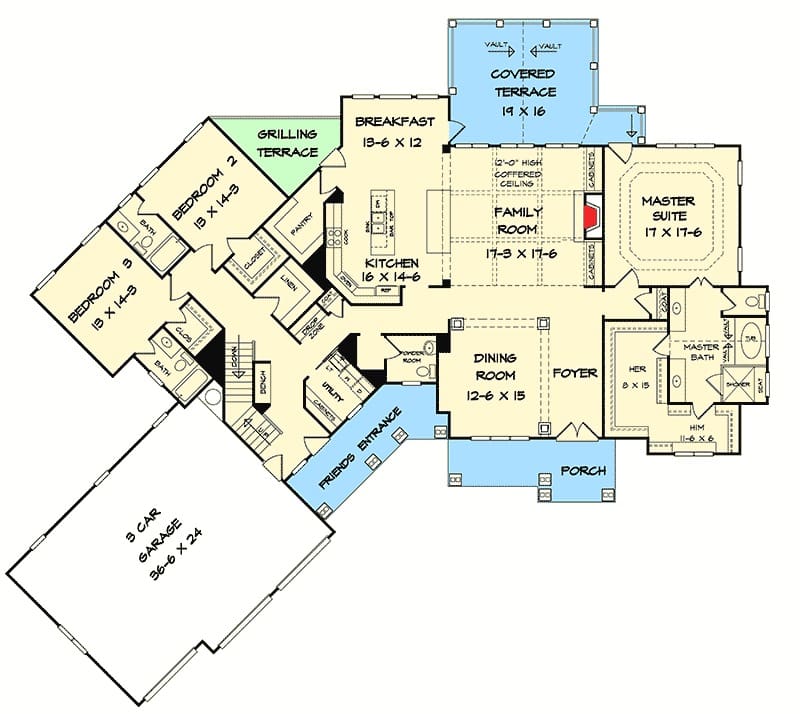 Outdoor spaces are where this plan really shines. Off the kitchen, you’ll find a grilling porch perfect for family cookouts, impromptu weekend brunches, or just showing off your BBQ skills .