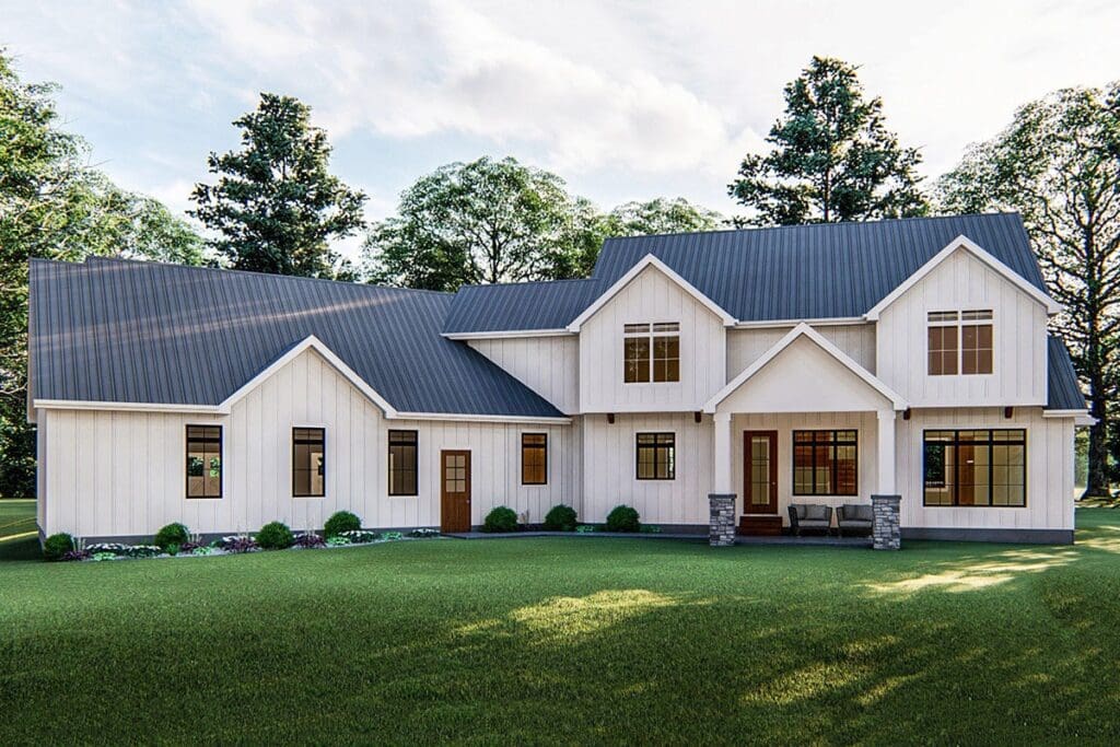 The board and batten siding gives it that classic farmhouse texture, while the sleek metal roof says, “I’m trendy, but I still know how to cook a mean Sunday roast.”