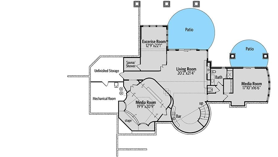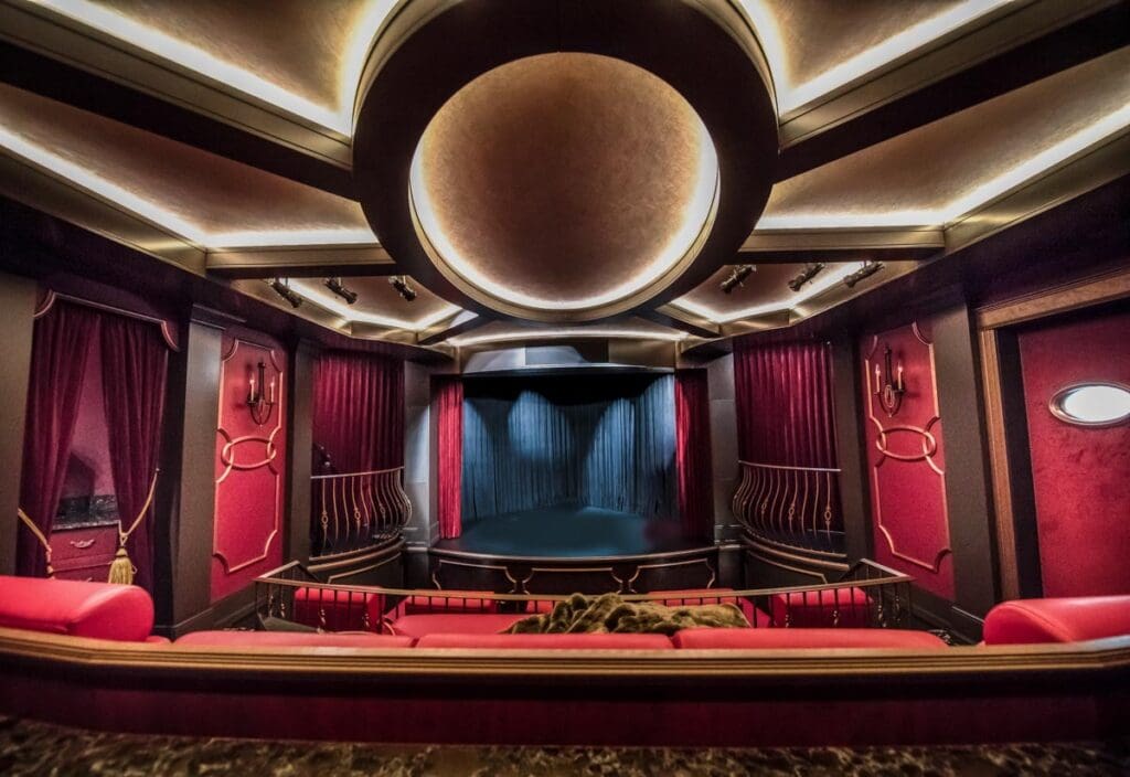 Imagine two media rooms — one with a stage for movie nights, karaoke, or family performances.