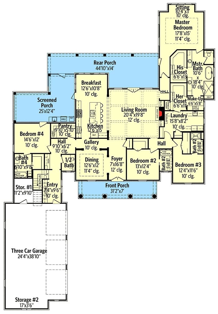 And let’s talk ceilings. We’re not working with basic here — oh no. This plan features 10-foot ceilings throughout, with even higher decorative touches in the living room, dining area, and master suite. Fancy, right? It’s like your home got a promotion and started dressing better.