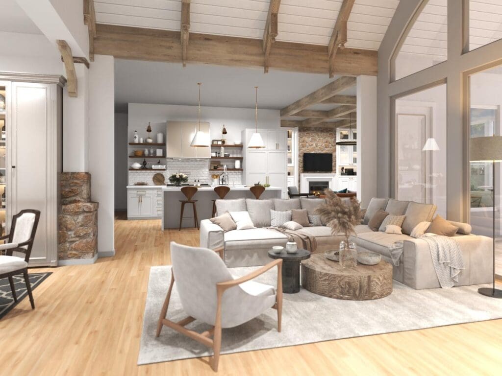 Vaulted ceilings add grandeur, while a central fireplace keeps things cozy and grounded.