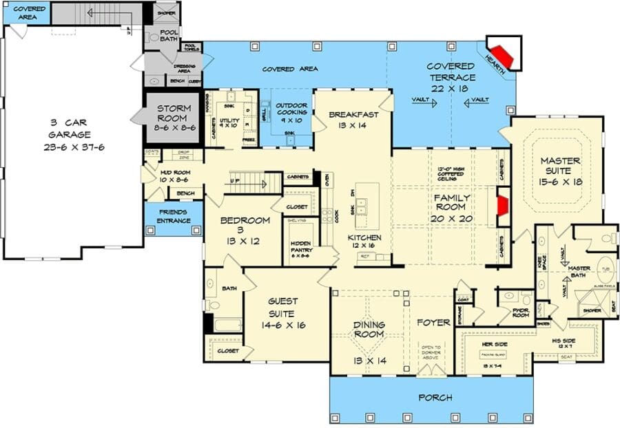 The side-load garage not only makes the exterior design corner-lot friendly, but it also offers space for three cars and includes a storm room off the garage.