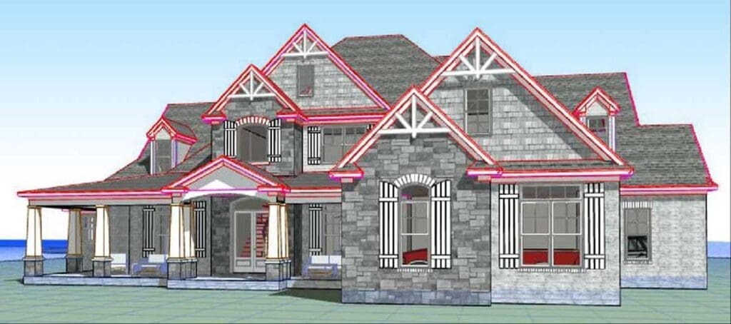 With its rugged stone and classic shingle exterior, accented by detailed brackets in each gable, it balances rustic charm with strong architectural presence.