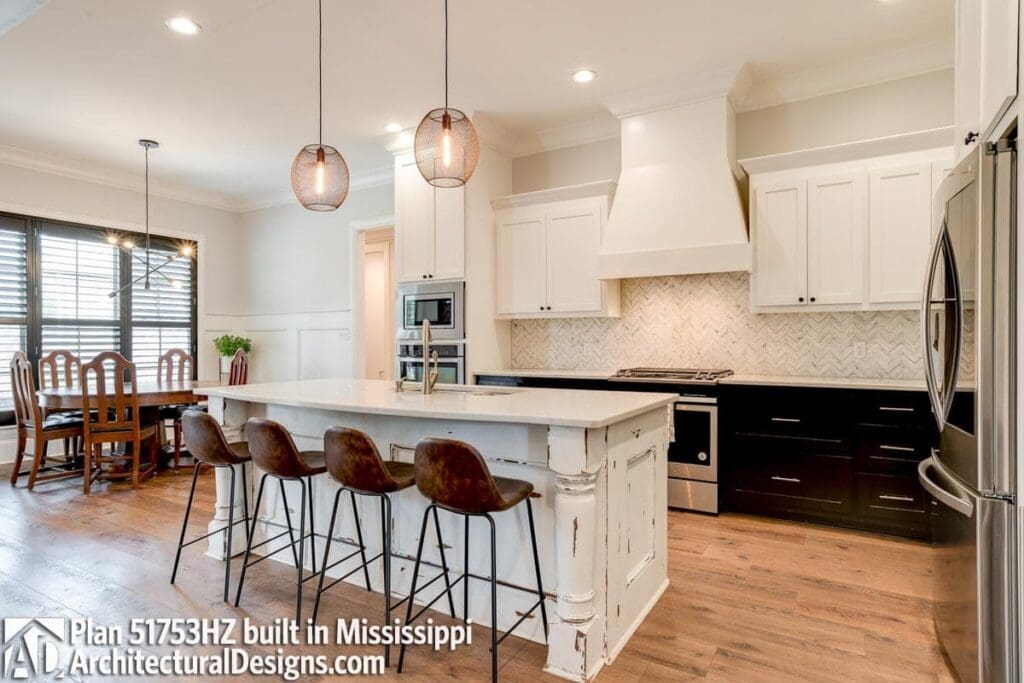 The oversized island is the centerpiece, offering bar seating for quick bites, homework sessions, or midnight ice cream raids.