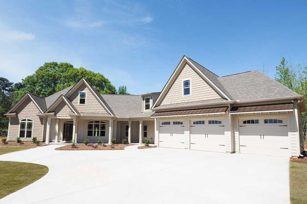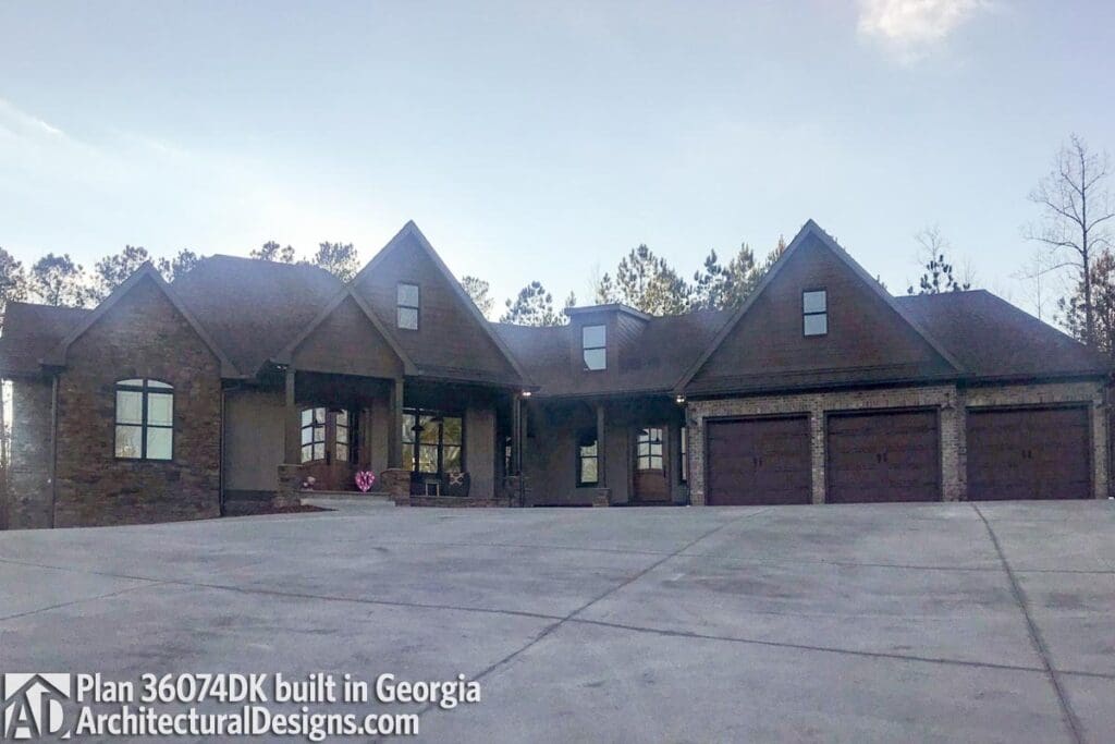 The angled 3-car garage with a shed roof, those charming wood supports, and a perfect blend of shingles and board and batten siding—it’s like the exterior walked right off the pages of your favorite home improvement magazine.