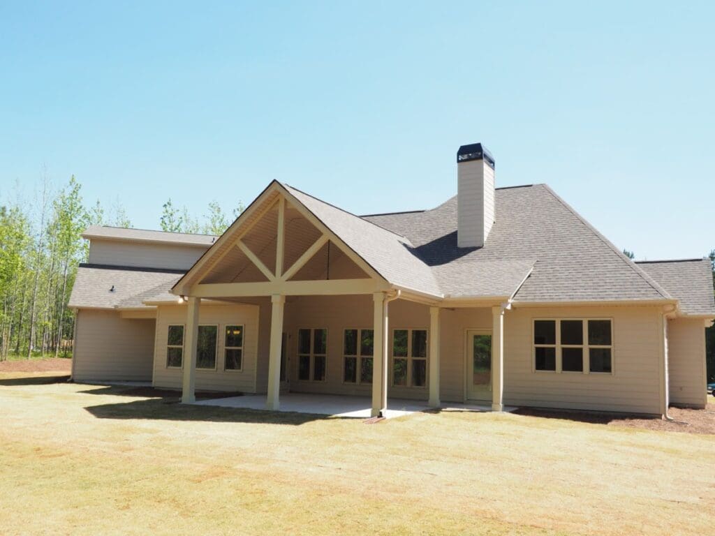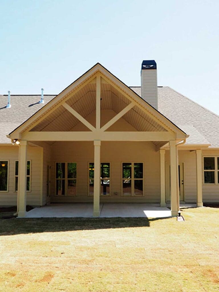 The back of the home opens to a vaulted covered terrace—fancy talk for “huge patio with a tall ceiling that looks ridiculously good in string lights.”