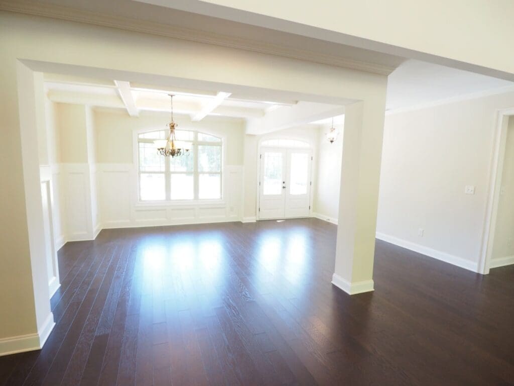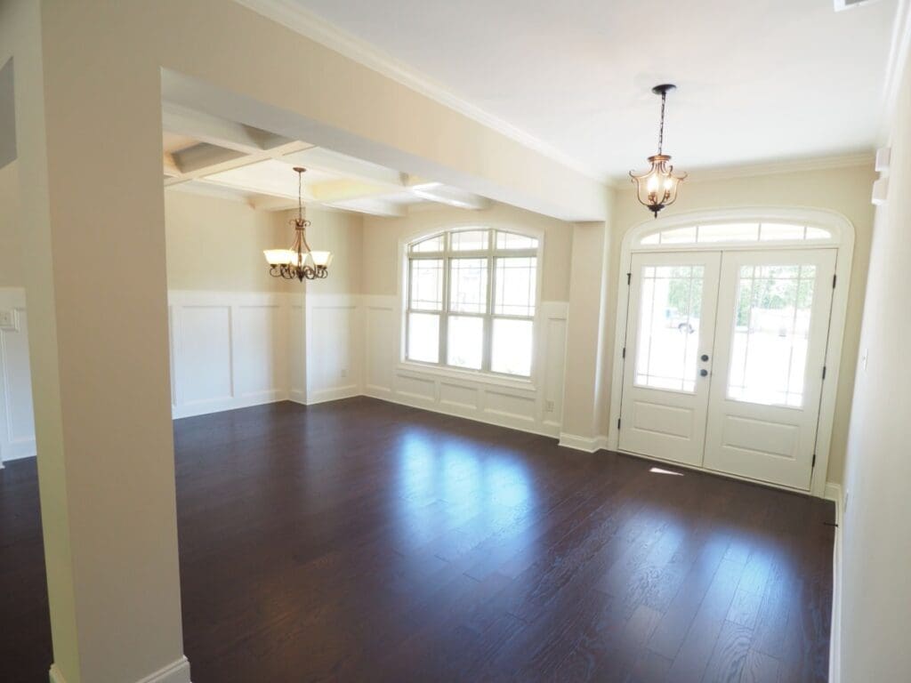 Both spaces are within view of the family room and kitchen, creating an open flow that feels warm, welcoming, and ideal for entertaining.
