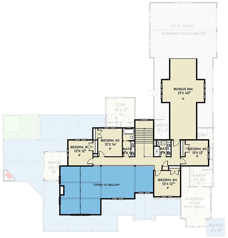 The second floor of this plan features four additional bedrooms arranged for privacy.