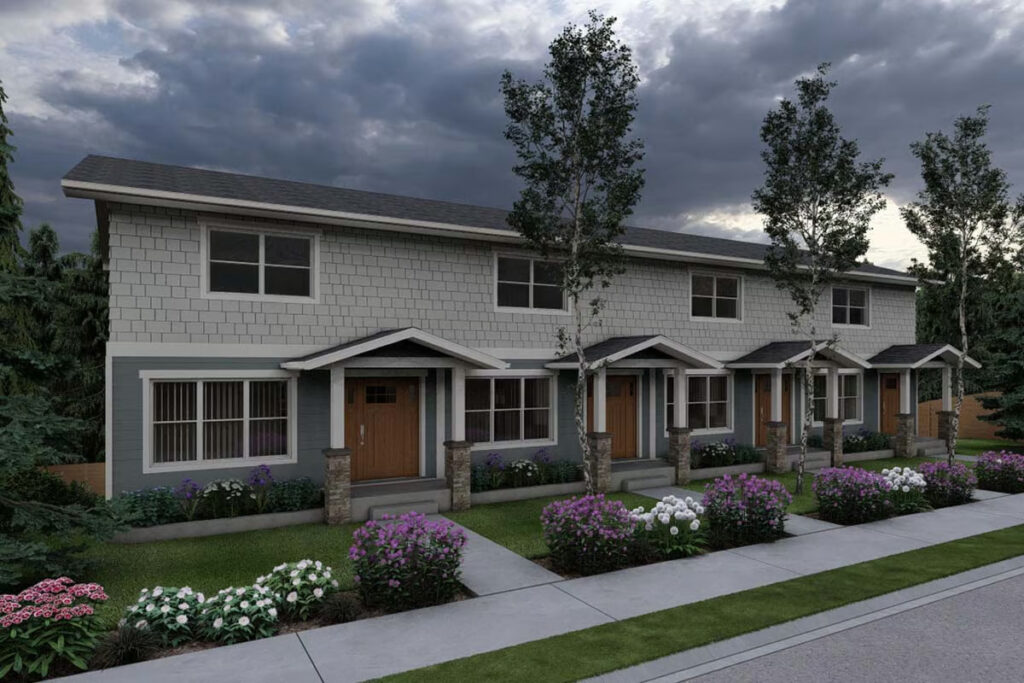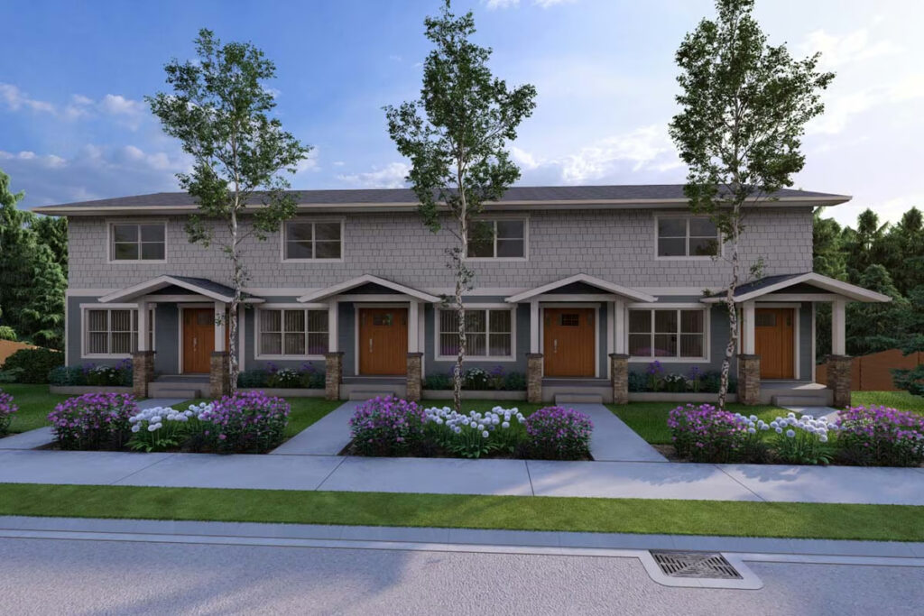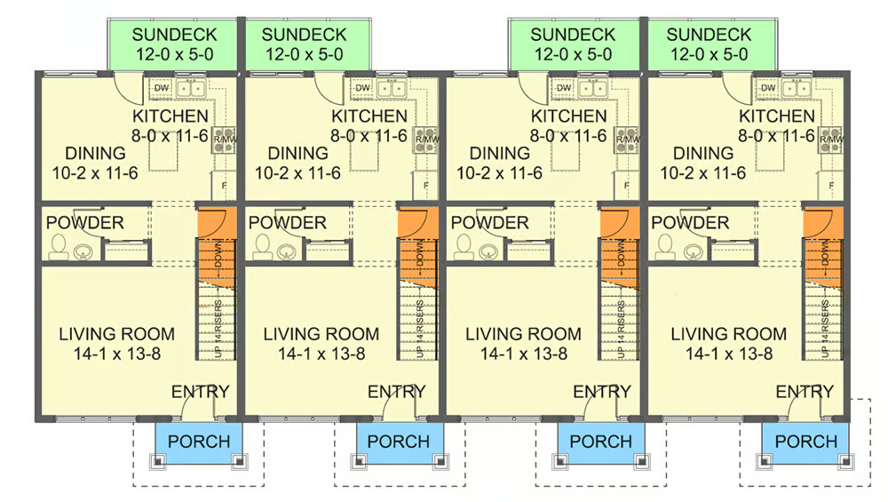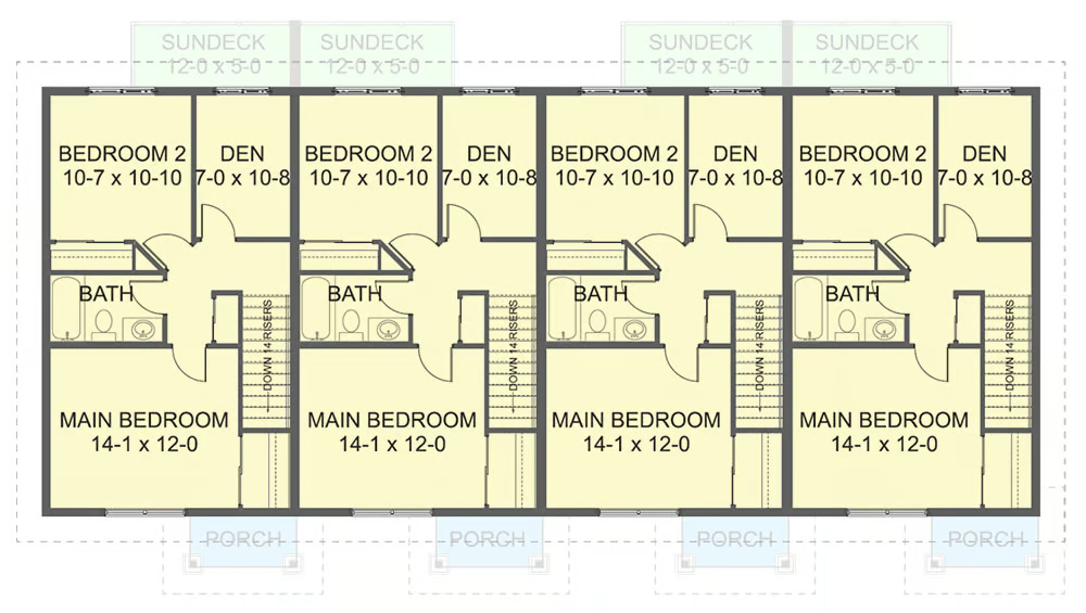 This house plan is multifunctional—four attractive units sit side by side, each with a charming covered front porch.