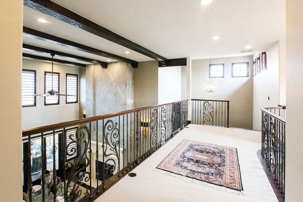 The second floor is accessed via a staircase leading to a bridge hallway.
