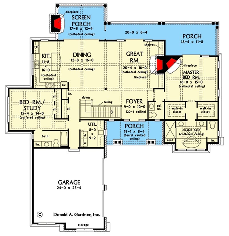 With cathedral ceilings, outdoor barbecue porches, fireplaces galore, and a side-load garage that practically begs to be parked in, this plan checks every box.