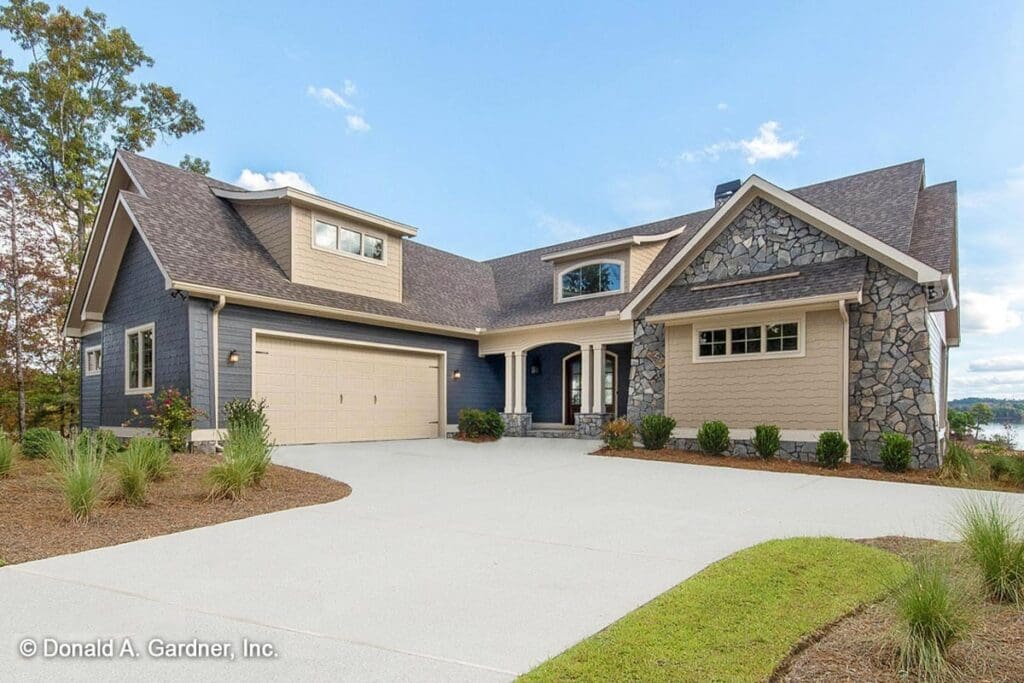 Let’s talk about that first impression. You pull up, and bam—stone arches, elegant rooflines, and a sloped shed dormer over the garage that makes you feel like you’ve arrived at your own personal chateau. It’s a hillside walkout plan that doesn’t just sit on the land—it belongs there.