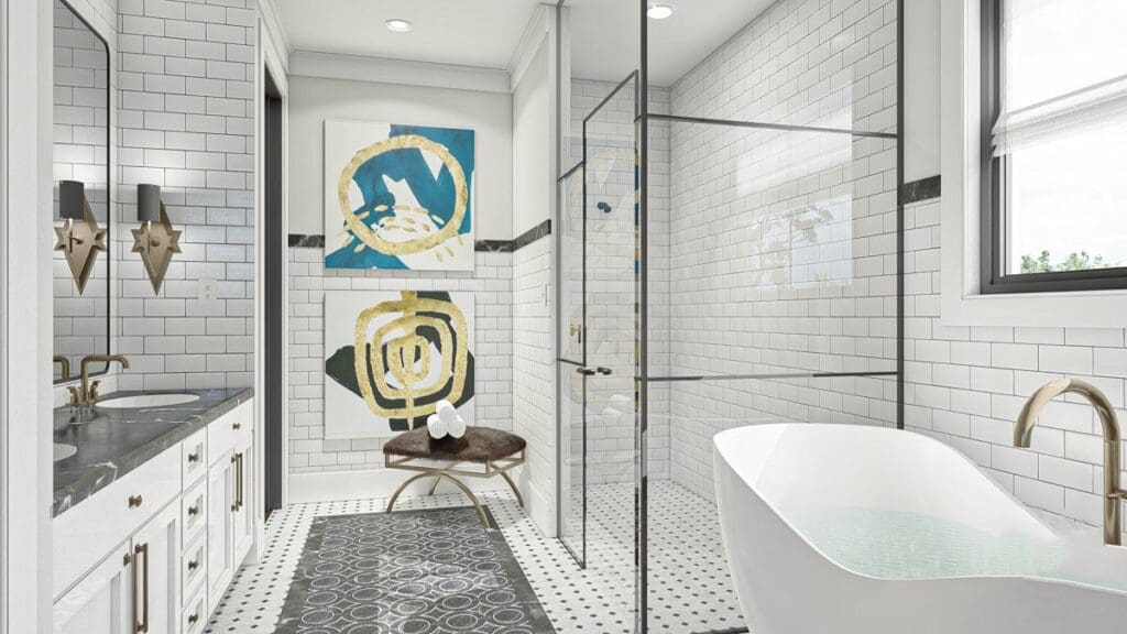 There’s a large soaking tub, walk-in shower, private toilet area, and enough elbow room for two people to brush their teeth without passive-aggressive sighing.