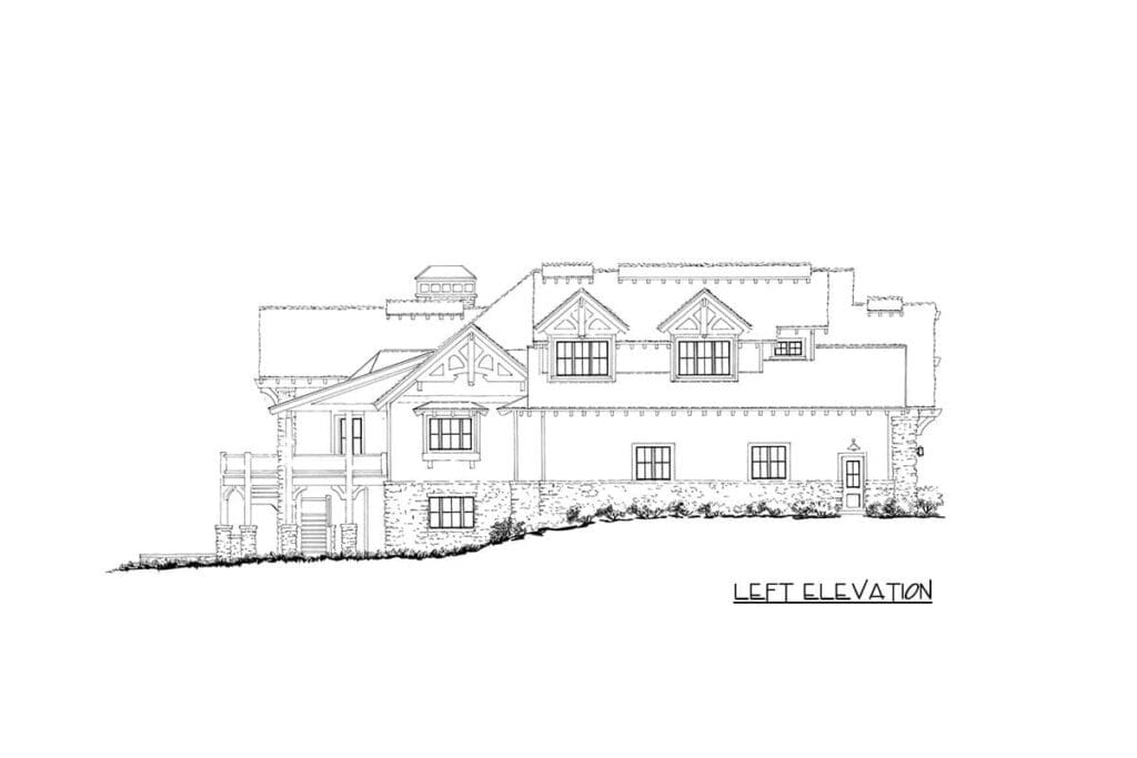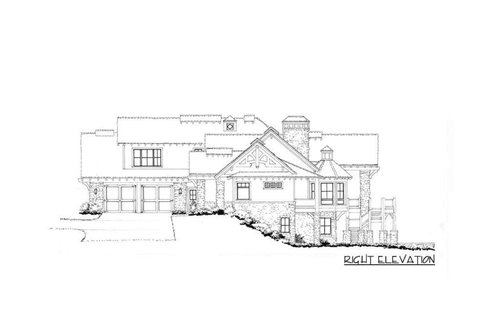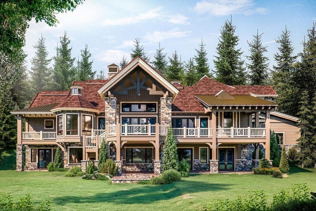 The beauty of this plan lies in its balance. The exterior, with its turret-style roof accents, timber-framed gables, and stone details, gives off a rugged yet refined Mountain Craftsman vibe. But inside, the design feels timelessly modern—open, light-filled, and flexible.