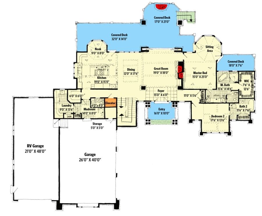 Elegant 6-Bedroom Transitional Farmhouse with 2-Story Layout, Courtyard Entry & RV Garage (Floor Plan)