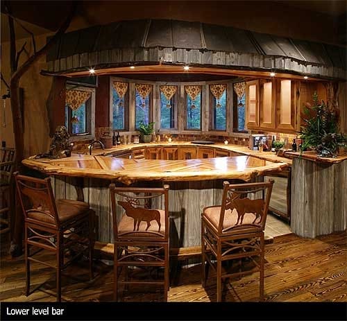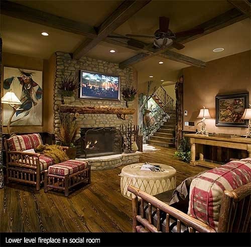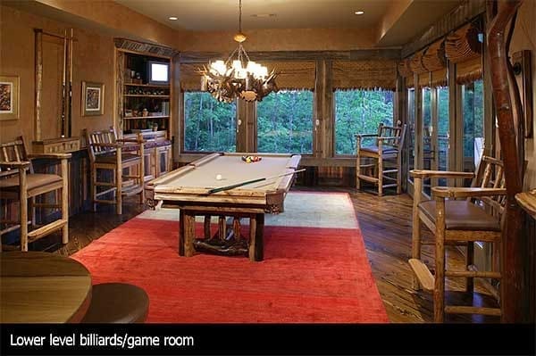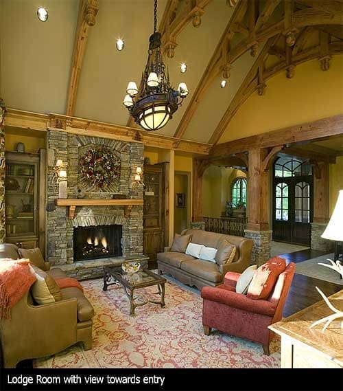 At the heart of the main floor is the vaulted lodge room, complete with a grand fireplace and a towering wall of windows.