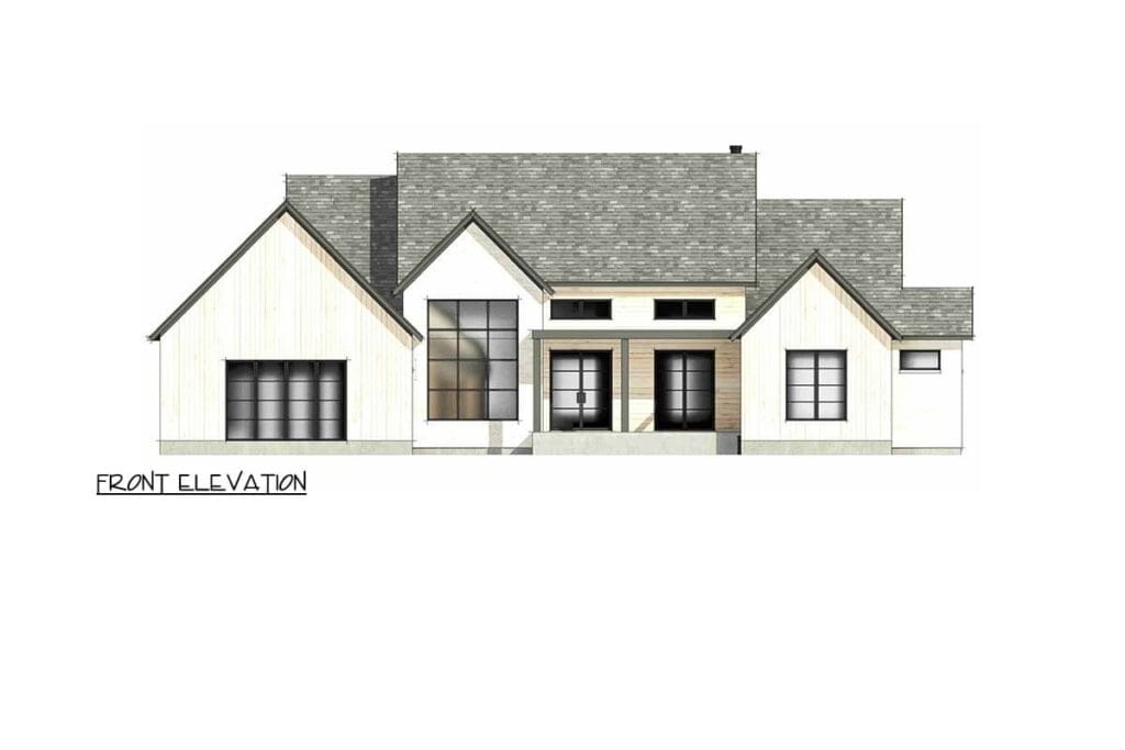 With 5.5 bathrooms, a home theater, a recreation room, and a courtyard-style three-car garage, this single-story plan blends old-world European charm with modern Scandinavian simplicity.