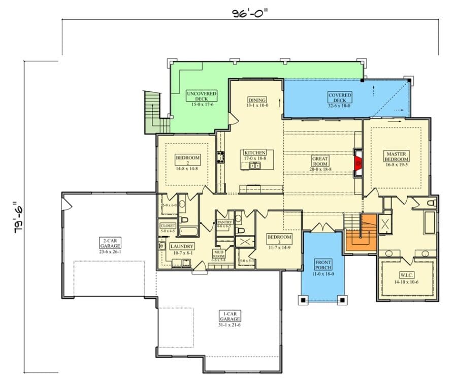 You can move easily between the kitchen, dining room, and great room without obstruction—a clear advantage of this layout.