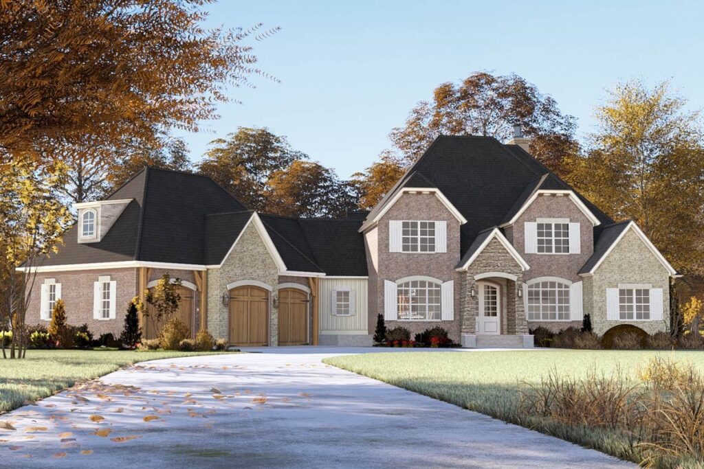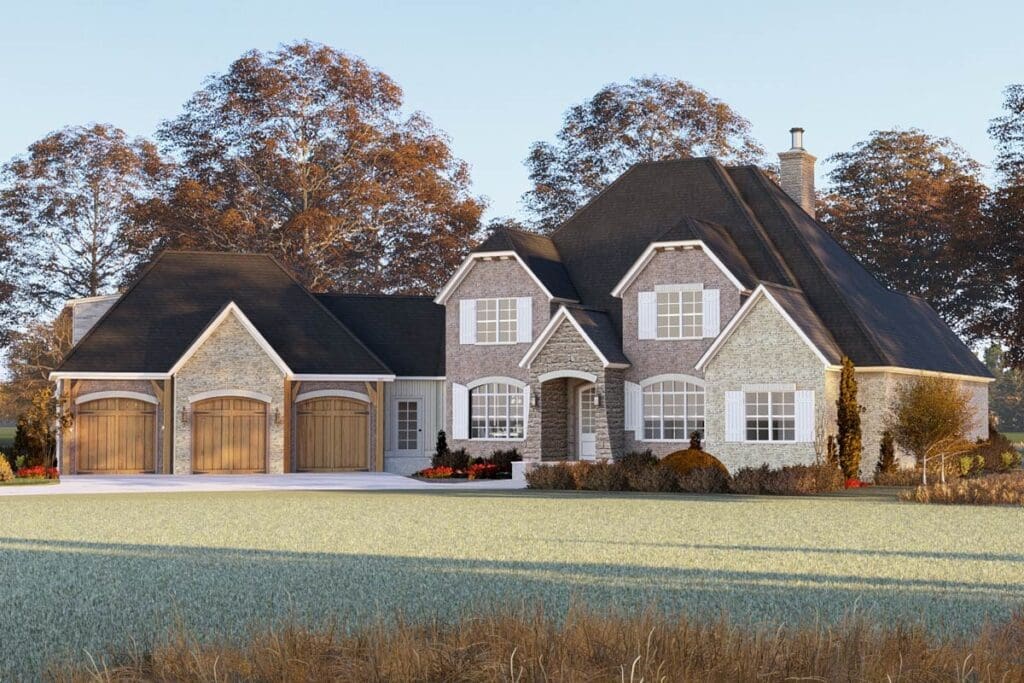 Well, this French Country-style two-story home definitely gives off that vibe—with its charming gables, storybook entryway, and enough space to host Thanksgiving dinner and still have room for a game of hide and seek.