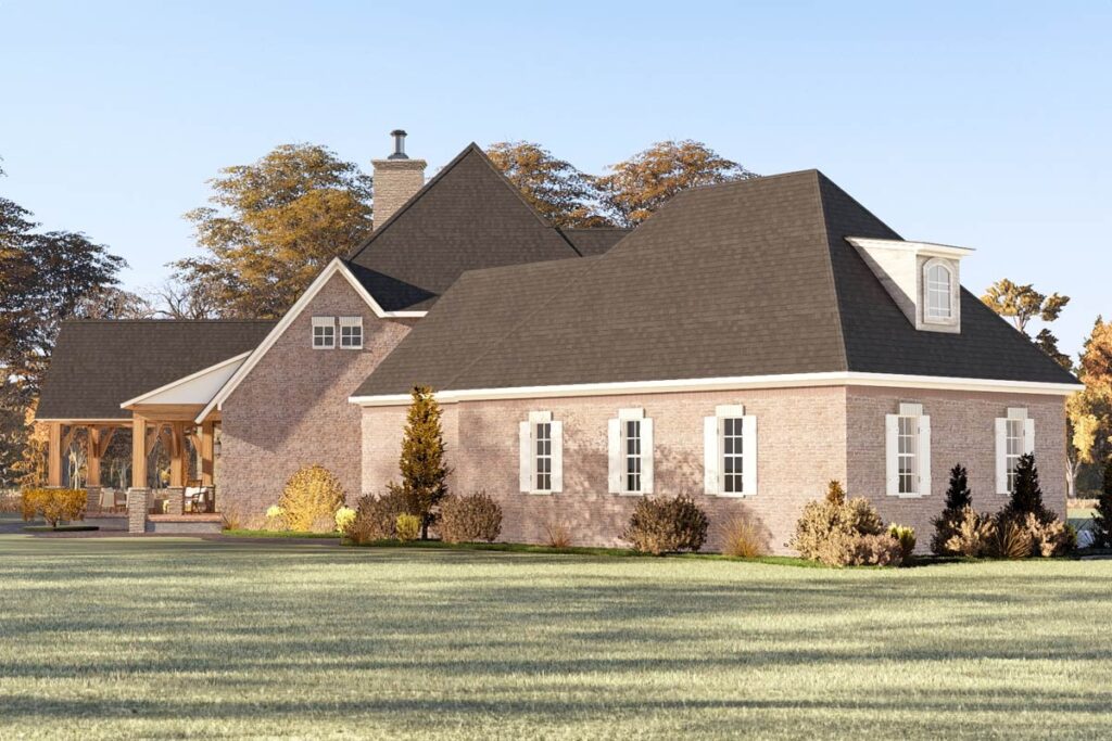 Flanked by two clipped gables and boasting charming wood shutters, the façade whispers sophistication without shouting it from the rooftop.
