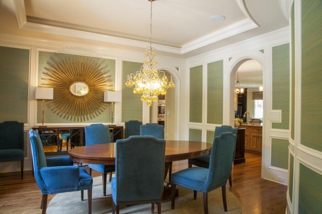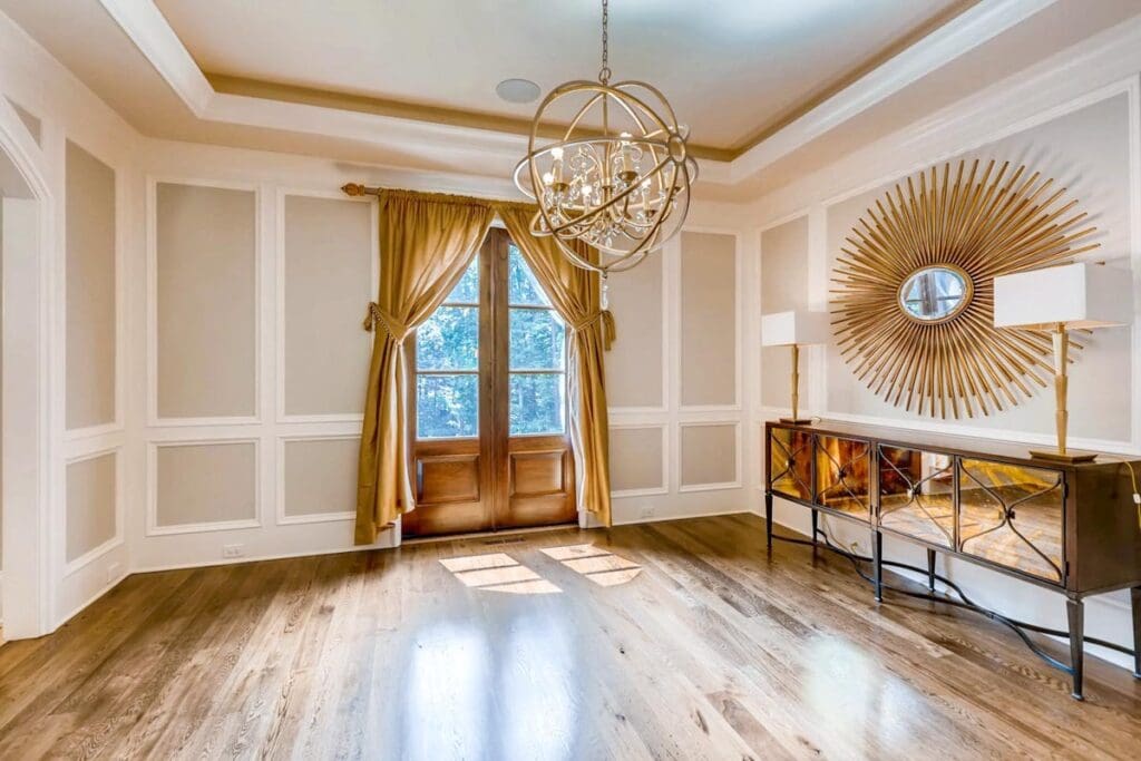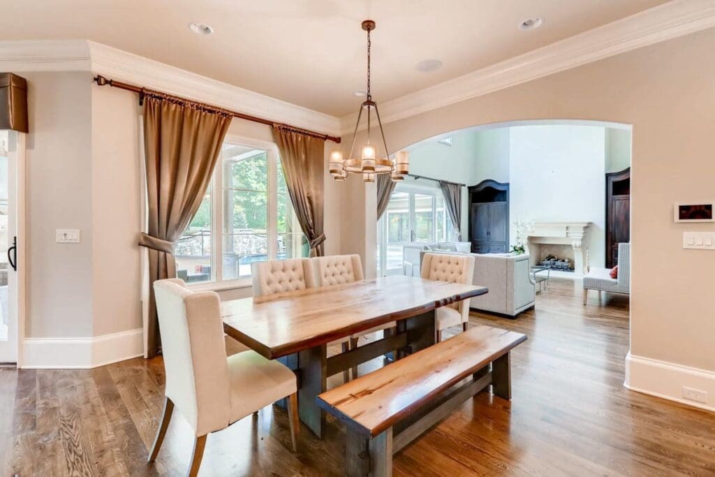 To your left, a sophisticated dining room awaits candlelit dinners or Tuesday night takeout with flair.